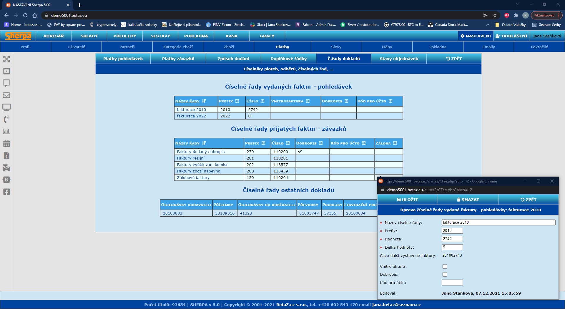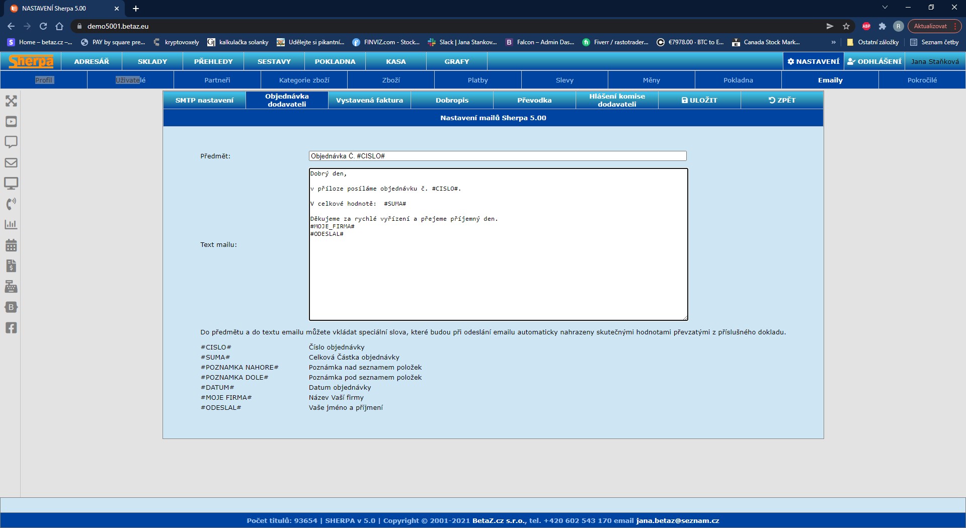 Systém umožňuje odesílat emaily pro určité druhy dokladů napřímo a to jak v PDF, tak v CSV, anebo TXT formátech. Jedná se o doklady jako Objednávky, Faktura, Dobropis, Převodka a Hlášení komise. Pro každý typ dokladu si můžete před nastavit Předmět a text emailu a povolené proměnné, které budou nahrazeny aktuálními údaji dokladu. V sekci SMTP nastavení je nutno nastavit základní údaje k odesílaní, to znamená jestli bude email odesílaný z SMTP serveru SHERPA, anebo použijete vlastní SMTP server kde vedete svůj emailový účet.