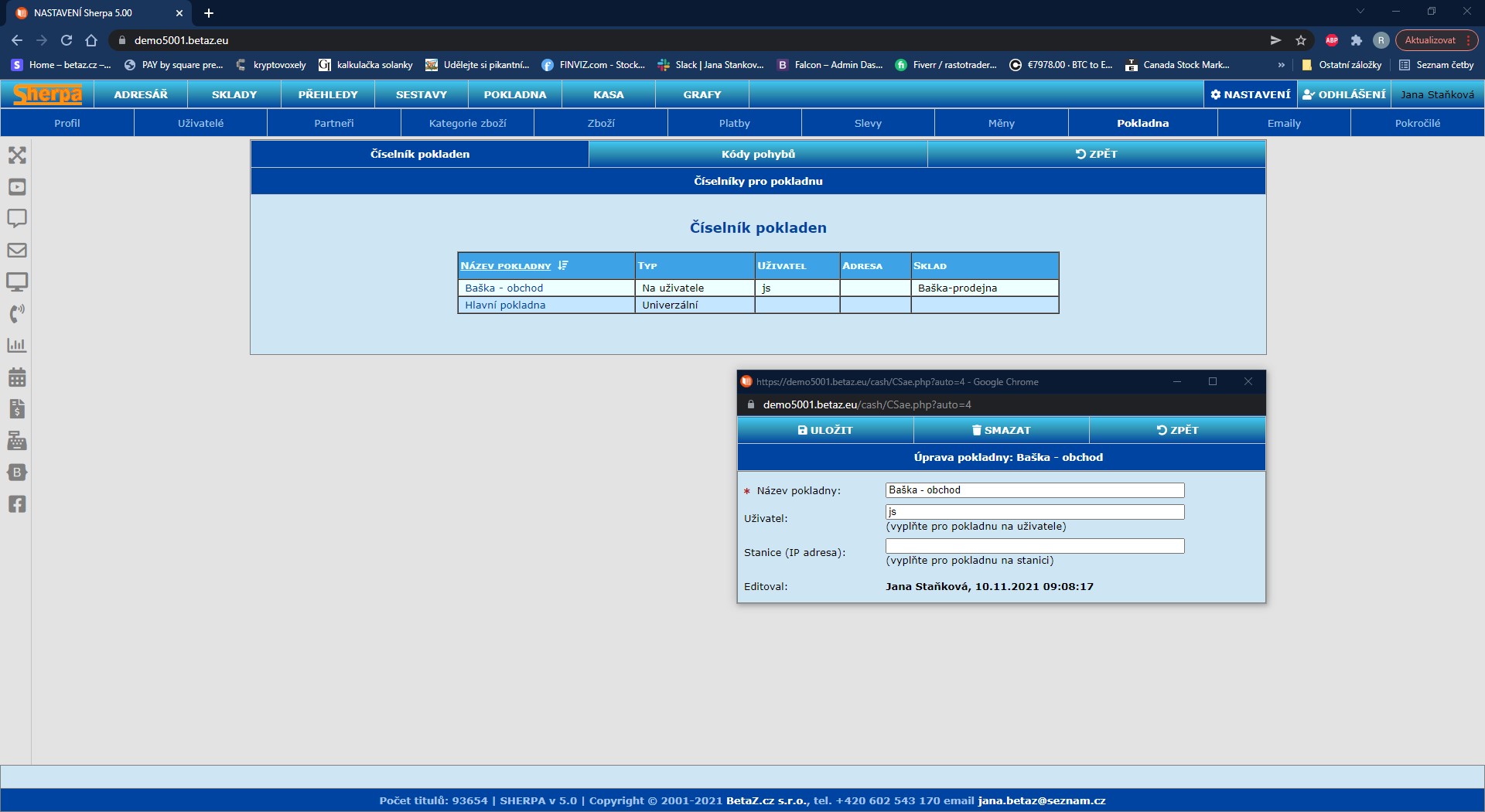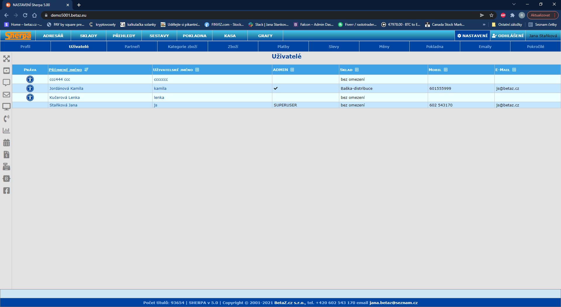 Nastavení uživatelů, umožňuje velice podrobné nastavení přístupových práv k jednotlivým modulům a specifikaci co může a co nemůže konkrétní uživatel dělat.