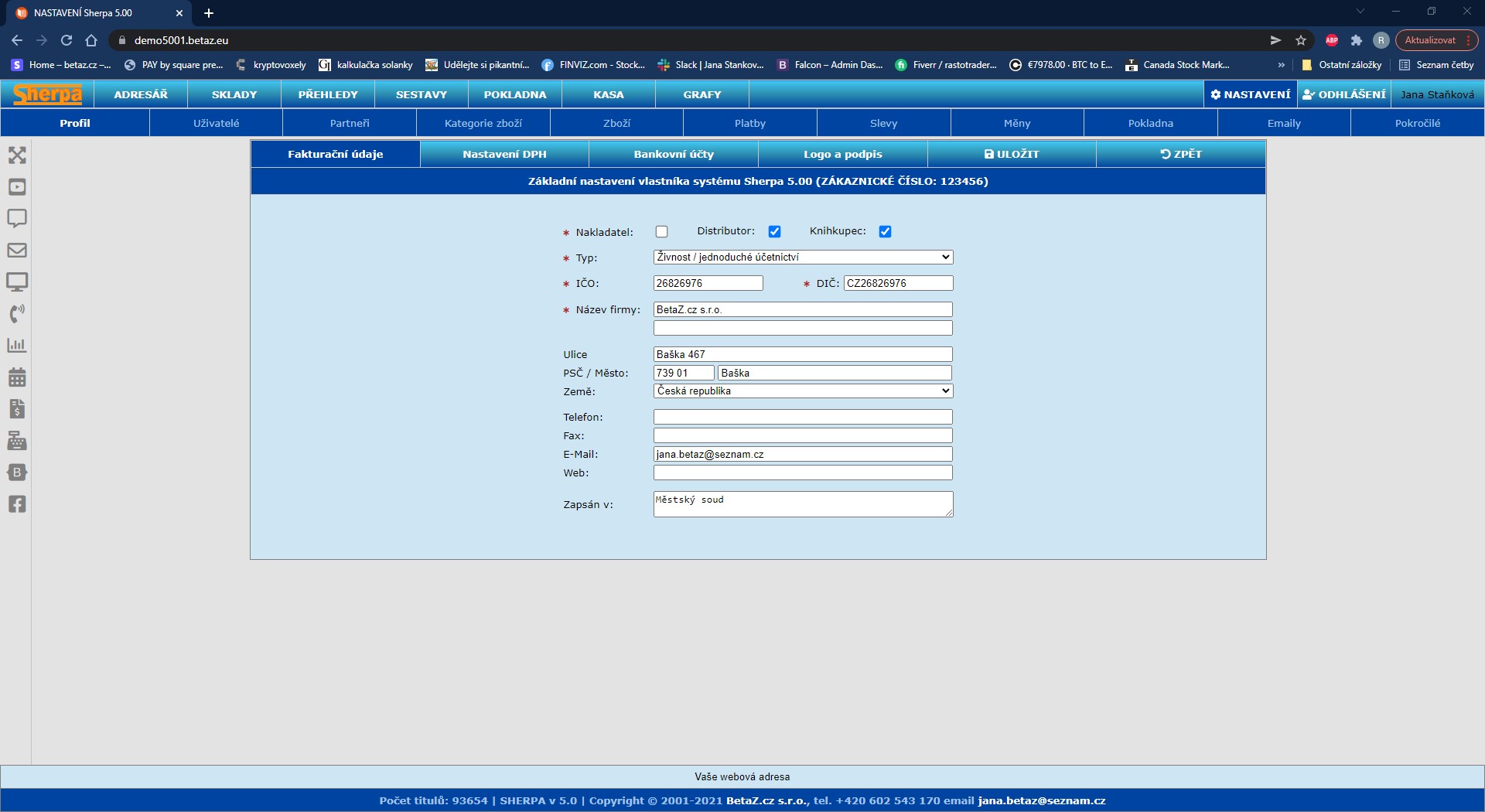 V Profilu se nastavují základní Fakturační údaje uživatele (společnosti) a je to povinná položka ), které se budou zobrazovat v každém vystaveném dokladu.