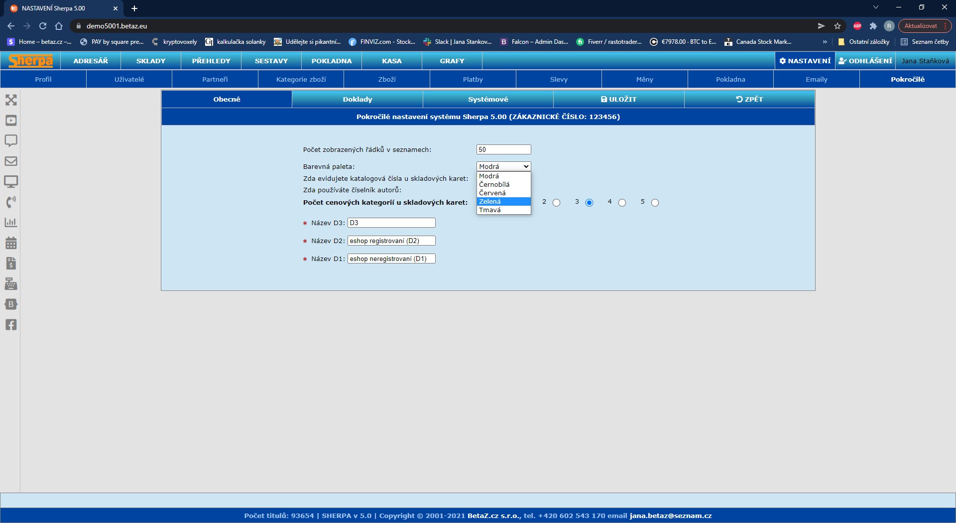 Pokročilé nastavení umožňuje nastavit, specifické vlastnosti Jako je : Počet zobrazených řádků v seznamech ( opatrně = rychlost ), Dále je možno použít nastavit si barevnou paletu platformy Modrá, Červená, Zelená, Černobílá ; množství a názvy cenových kategorií, zaokrouhlení na dokladech a systémové.
